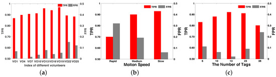 The comparison of TRP and FPR. (a) TPR and FPR under different volunteers; (b) TPR and FPR under different speeds; (c) TPR and FPR under different numbers of tags.