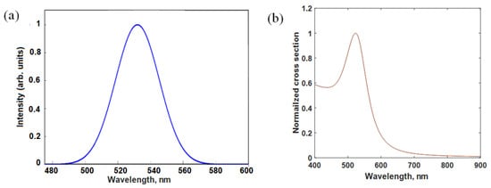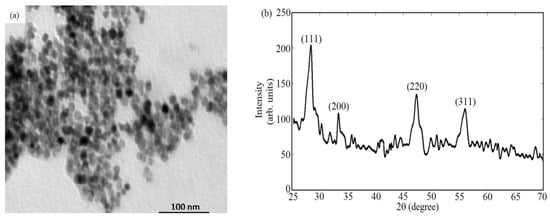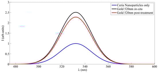 The cerium oxide nanoparticles synthesis was performed using a chemical precipitation technique for simplicity []. For each sample, cerium chloride (Sigma Aldrich, St. Louis, MO, USA, 0.5 g) has been added to distilled water (40 mL) with ammonium hydroxide (1.6 mL) added as a catalyst. Then, the solution is stirred at temperature of 50 °C for two hours at a stirring speed of 500 rpm, then the stirring is continued for 24 h at room temperature. The first heating step is important to avoid the formation of cerium hydroxide. After the full period of stirring, the sample is centrifuged and washed with ethanol to remove any reacted cerium chloride. Gold nanoparticles (Sigma Aldrich) of 20 nm diameter have been selected so that optical plasmonic resonance is in the same range of fluorescence emission of ceria nanoparticles, as will be shown later in the Results section. Gold nanoparticles are added in two ways: firstly added with the initial precursors before the stirring which we call it in-situ, and the second way is to add gold nanoparticles as a post-synthesis step after the full synthesis of ceria nanoparticles. In both modes of gold addition, a 1 mL solution of gold nanoparticles has been added to the ceria solution. Thus, the technique which leads to the highest intensity of fluorescence emission could be checked.