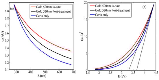 In addition to the coupling between plasmonic resonance and fluorescence emission, the added gold nanoparticles can help in better formation of trivalent cerium ions. The formation of Ce3+ ionization states correspond to a better probability of 5d–4f transition and consequently the enhancement of fluorescence emission intensity. Figure 4a shows the absorbance dispersion of ceria nanoparticles, with and without added gold nanoparticles, along with the corresponding bandgap calculations in Figure 4b. Equation (1) describes how to calculate the allowed direct bandgap from the linear region of the absorbance dispersion curves []: