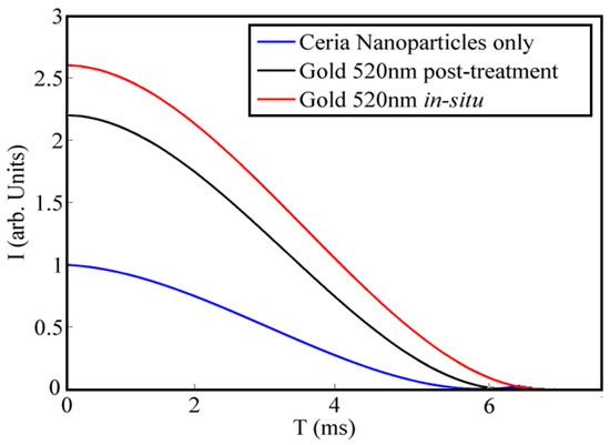 Another optical characteristic is shown in Figure 5 related to the fluorescence lifetime measurement of ceria nanoparticles with and without added gold nanoparticles. It can be observed that adding the plasmonic nanostructure reduced the emission lifetime from 4.6 ms in case of no added gold up to 3.9 ms in case of in-situ added gold nanoparticles. The coupling between the plasmonic resonance and fluorescence visible emission under ultraviolet excitation leads to smaller fluorescence lifetime corresponding to higher emission intensity.