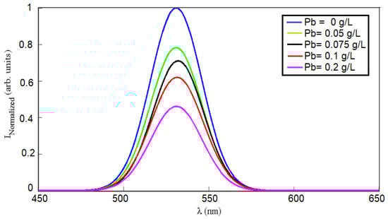 Based on the intensity change as shown in Figure 6, the relative change in the fluorescence emission intensity at different Pb concentrations is described in Figure 8. The linear relation is analyzed by the Stern-Volmer equation []: