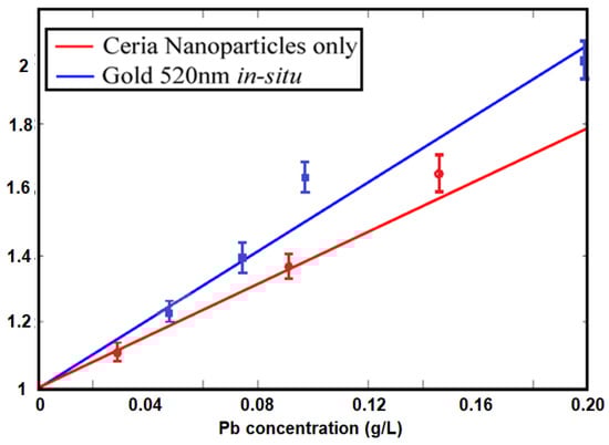 where Io and I represent the peak intensities of the steady-state fluorescence in the absence and presence, respectively, of the lead particles quenchers, KSV is the Stern–Volmer quenching constant which is an indication for the sensitivity of the nanostructure to optically detect the quencher [], and [Q] is quencher concentration; which here is the lead particles. Figure 8 shows relatively linear behavior between the relative intensity and the quencher concentration. The value of the calculated KSV is 2.424 M−1 for in-situ gold-ceria nanoparticles according to the lead quencher, compared to 1.645 M−1 for ceria nanoparticles only. That proves the enhancement of sensitivity by around 50% due to the coupling with plasmonic gold nanoparticles.