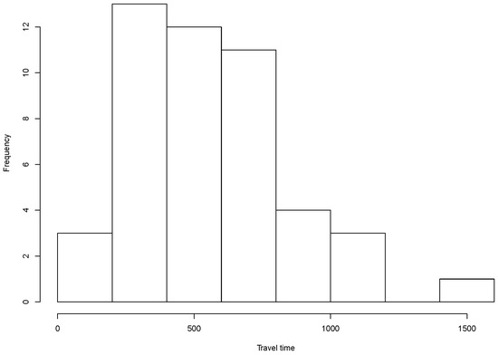 In our simulated scenario, each mobile bike generates a data packet every second. The travel time of bikes corresponds to the trip duration of each bike in the simulation. The longest travel time of bicycles is 1418 s while the average one is about 550 s, as illustrated in the histogram in Figure 4.