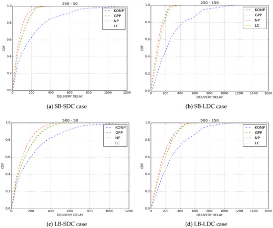 The delivery delays of received packets are depicted in Figure 6. We observe that, as expected, NP policy has the best results in terms of delivery delay since it drops old packets. KONP gives the worst performance. This is an evident outcome for a policy of which only old packets are forwarded. GPP and LC policies have the same performance as NP while giving a better loss rate. This means that there are older packets that are transmitted and the fact that they have similar delay distribution shows that they are sent very quickly.