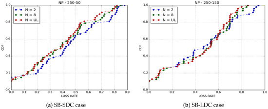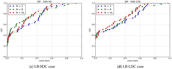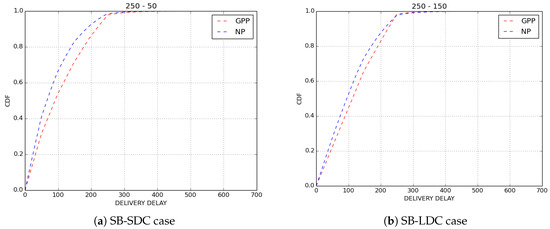 In Binary Spray and Wait DTN protocol [45], the number of copies is limited to 8. By assigning the number of copies to 2, IoB-DTN gets the behavior of Two-Hop Relay DTN protocol [47]. The operation of this protocol is simple and works as follows: all packets are duplicated to only first encountered nodes, then the source node and the first encountered neighbor node will carry the duplicated packets until a base station comes in range. When (large value), IoB-DTN imitates the behavior of Epidemic Routing DTN protocol [17] which floods the network. Here, we are interested in comparing these three variants to evaluate the impact of the number of copies sprayed in the network. We only give a comparison between GPP, which provides better performances on loss rate and delivery delay, and NP, which offers the best delivery delay.