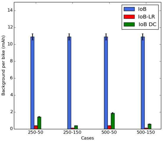 Here, we compare six variants of IoB-DTN protocol: the multi-hop IoB without data aggregation, IoB with one hop, IoB-Long range, IoB based on spatial aggregation, IoB based on temporal aggregation and IoB based on spatiotemporal aggregation. IoB with one hop behaves similar to the multi-hop IoB without aggregation except only bike-to-bike station communication is applied. The difference between IoB with one hop and IoB-LR is the communication range value. For the first variant, we keep the same communication range (∽350) as the multi-hop IoB without aggregation, whereas we consider, as discussed before, a radio propagation that provides ∽1 km as communication range for IoB-LR.