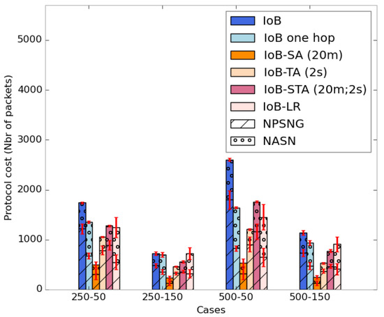 Figure 42 shows the average protocol cost of the six variants of IoB-DTN protocol. It is important to mention that applying data aggregation mechanism on IoB protocol reduces the communication cost in the network compared to other variants. More precisely, IoB with spatial aggregation offers the lower protocol cost.