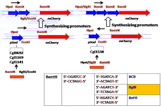 Strong promoters can be selected according to comparative transcriptional analysis, and their strength can be characterized by fusing an immunofluorescent protein, such as the mCherry or GFP gene, for fluorescence testing, which enables HTS of transcription factor-acting molecular drugs. However, most of the time, the activity of a single promoter in response to a compound is so weak and insufficient that it cannot be effectively characterized; as a result, promoters need to be synthesized to enhance their performance through certain DNA assemble techniques, like the DNA brick method, which utilizes isocaudarner ligation for connecting a series of promoters [,]. The approach of synthesizing promoters of Corynebacterium glutamicum from two directions are illustrated in Figure 1.
