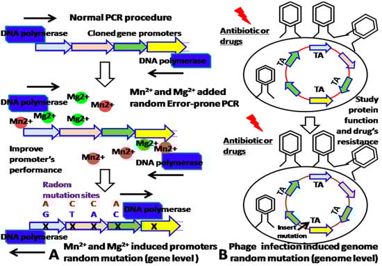 (A). Mn2+ and Mg2+ added random, error-prone PCR approach introduces the gene mutation sites at the gene level. (B) Phage infection introduces random genome mutation sites.