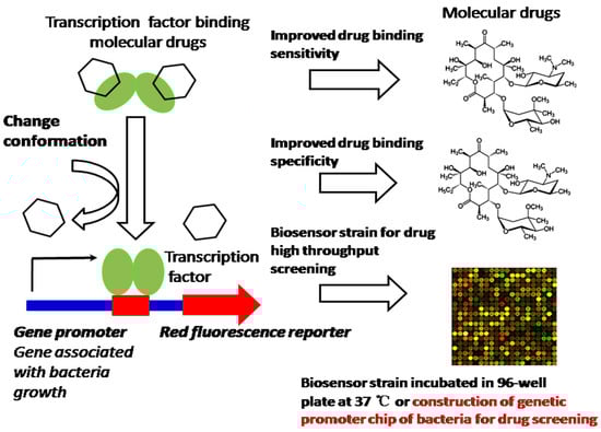 Construction of biosensor strain and genetic promoter chip of bacteria for high-throughput screening (HTS) transcription factor (TF)-acting molecular drugs.