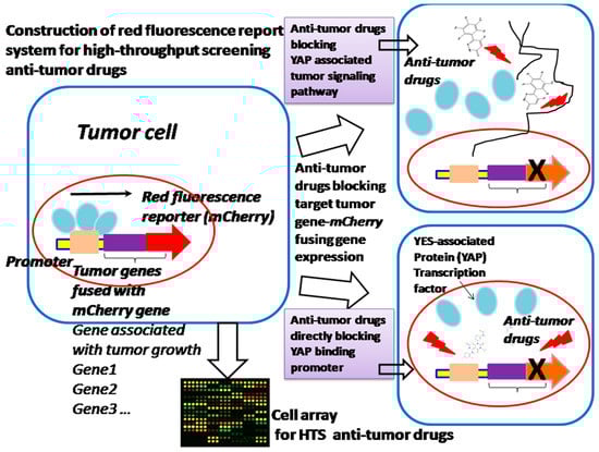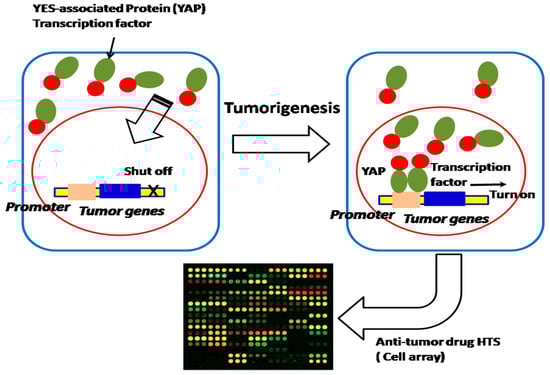 Construction of HTS platform (cell array) for HTS anti-tumor drugs. Anti-tumor drugs block YES-associated protein (YAP) transcription of tumor genes, which can be applied for drug HTS.
