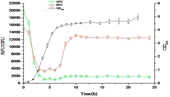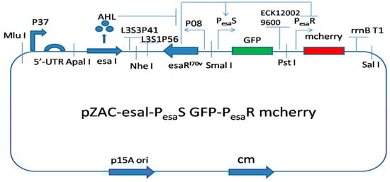 Due to the strong luminescent properties of immunofluorescent proteins, we could integrate both low and high bacteria density-responsive promoters into the genetic regulatory circuit for probing the cell density [,] (Figure 8). This biosensor could be in response to N-Acyl-homoserine lactone (AHL), which is the signal molecule of the quorum sensing system of bacteria and probes the growth density of bacteria, which in turn provides instructions for how to balance cell growth density, in order to improve the valuable product production (Figure 9).