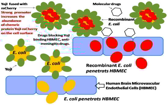 In our previous studies, we found that in the membrane protein of E. coli, YojI can mediate the interaction of E. coli and human brain microvascular endothelial cells (HBMECs), by using both the human and E. coli proteome chips in conjunction with cell labeling techniques for the discovery of microbial and host factors. We identified that YojI binds to the interferon-alpha receptor (IFNAR2) on the surface of HBMECs and mediates E. coli adhesion to the host cells, and is an important virulence factor for E. coli invasion of HBMECs []. It is reported that YojI is also a chemically-induced biosensor for regulating its own expression, a leucine-responsive regulatory protein; Lrp controls the expression of YojI, which regulates exporting of toxin J25 [,,]. Therefore, the strong promoter can be identified and cloned before the chimeric YojI–mCherry gene to highly initiate the gene expression, and to strongly incorporate the YojI–mCherry chimeric protein onto the cell surface. When the recombinant E. coli infects HBMECs, the strong promoter initiates the chimeric YojI–mCherry protein expression will amplify the invasion signaling of E. coli in HBMEC. As a result, the strength of the promoter of YojI gene is correlated with the invasion efficiency of E. coli. The bacterium–host cell interactive mechanism, integrated with high-performance promoter, can be effectively utilized for HTS of meningitis drugs (Figure 11).