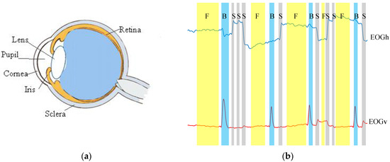 (a) The anatomy of eyeball; (b) The denoised horizontal () and vertical ( ) signal components. Three eye movement types are marked in gray: saccades (S), fixations (F), and blinks (B).
