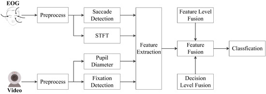 Figure 2 shows the overall architecture of emotion recognition based on eye movements. In the first step, raw EOG and eye movement video signals are preprocessed to remove artifacts. Next, time-frequency features extracted by the Short-Time Fourier Transform (STFT) [29] as well as time domain features according to saccades, fixations, and pupil diameters are calculated from the processed eye movement data. Finally, two fusion strategies are explored to improve the performance of the proposed emotion recognition algorithm.