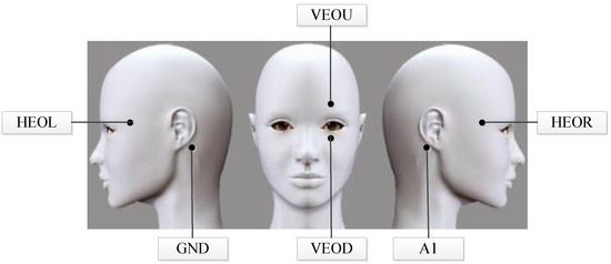 EOG signals are acquired by six Ag-AgCl electrodes together with a Neuroscan system (Compumedics Neuroscan, Charlotte, NC, USA). The distribution of electrodes is shown in Figure 3. Specifically, electrodes HEOR and HEOL fixed on the outer side of each eyeball with 2 cm are used to detect the horizontal EOG signals. Similarly, electrodes VEOU and VEOD arranged 2 cm above and below the left eyeball are applied to collect vertical EOG signals. Reference electrode A1 and ground electrode GND are attached to the left and right mastoid, respectively. Besides, an infrared camera with the resolution of 1280 × 720 is utilized to capture eye movement video signals. The height of the camera is the same level as the subject’s eyeball and the distance between the camera and the subject is 25 cm. In order to collect EOG and video signals synchronously, we use a specific acquisition software developed in our laboratory.