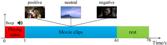 On this basis, we design an experimental paradigm (as shown in Figure 4) to acquire the emotional eye movement signals. Each trial starts with a presentation of a word “begin” displayed on the screen to prompt playing movie clip, followed by a short warning tone “beep”. Afterwards, three different emotion movie clips with the duration of 60 s are displayed at random. When the movie clip ends, the subject is allowed to relax for 15 s in order to attenuate the current induced emotion.