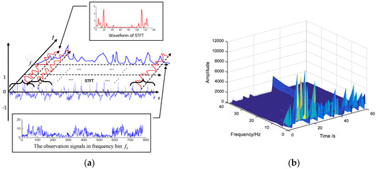 Time-frequency features extraction. (a) Demonstration of acquiring the frequency-domain observation vectors; (b) Time-frequency diagram after STFT.
