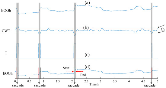 Detecting the saccade segments is an important step to acquire saccade time. Here, we adopt the Continuous Wavelet Transform (CWT) algorithm [26] to detect saccades. Suppose is the preprocessed horizontal EOG signal components, the CWT procedure can be expressed as: