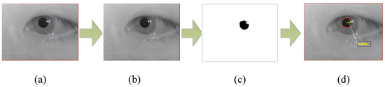 The process of extracting the pupil diameter. (a) The original eye movement frame picture; (b) the grayscale image; (c) the binary image, and (d) the diameter and the center of the pupil using the Hough transform.