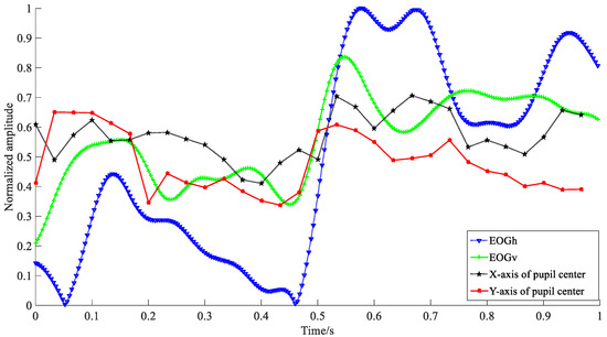 Figure 8 shows the waveforms of normalized EOG and video according to horizontal and vertical directions in 1 s, receptively. Apparently, the amplitude variations of EOG signals are larger than that of video signals. To detect fixation duration, we further compute the change amplitude of X and Y. Here, the variables of X and Y are the horizontal and vertical center points of the pupil in the current frame. Their values refer to the index of rows and columns, respectively. The detection procedure can be described as follows: