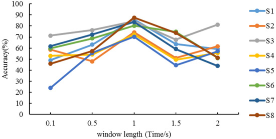 Because the time resolution of the STFT is determined by the width of the sliding window and the frequency resolution is decided by the spectral width of the window function, the length of sliding window plays an important role on extracting time/frequency-features using STFT. The longer the sliding window width is, the lower the time resolution and the higher the frequency resolution are. Considering the balance between the resolution of the frequency domain and accuracy in different frequency bins, we finally determine the point of STFT is 64. On this basis, we execute the performance evaluation using different length of window, i.e., 0.1 s, 0.5 s, 1 s, 1.5 s, and 2 s. All the number of overlapping sampling points are half the length of the window. The results of different subjects are shown in Figure 10.