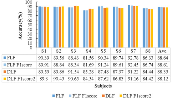 Next, we further perform the features fusion strategies to improve emotion recognition accuracy. The fusion strategies include feature level fusion and decision level fusion with maximal rules (described in Section 3.4). The accuracies of FLF and DLF for all subjects are shown in Figure 11.