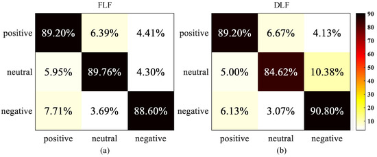 From Figure 11 we can observe that the FLF achieves the average accuracy of 88.64% and average F1 score of 88.61%; while the DLF with maximal rules obtains the average accuracy of 88.35% and average F1 score of 88.12%. Since the FLF directly concatenate two feature vectors of EOG and video signals to train the detection model, it can provide more complementary emotion information than DLF. On the other hand, there is still a slight increment of accuracy compared with only using the single feature. Therefore, the recognition performance of the DLF is lower than that of the FLF. To further evaluate their performance, we compute the confusion matrix in the case of three emotions, i.e., positive, neutral, and negative. The results are shown in Figure 12.