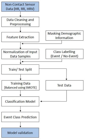 Prediction model for event class prediction. HR: Heart Rate; RR: Respiration Rate; HRV: Heart Rate Variability; SMOTE: Synthetic Minority Oversampling Technique.