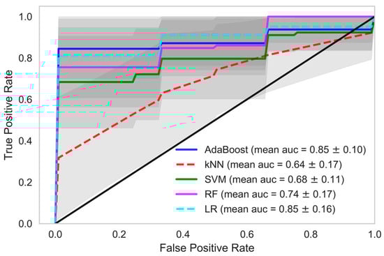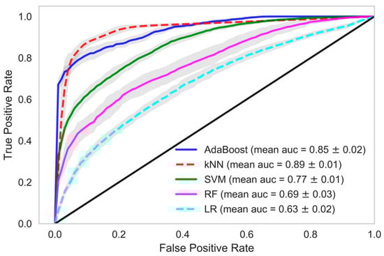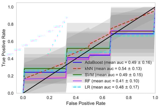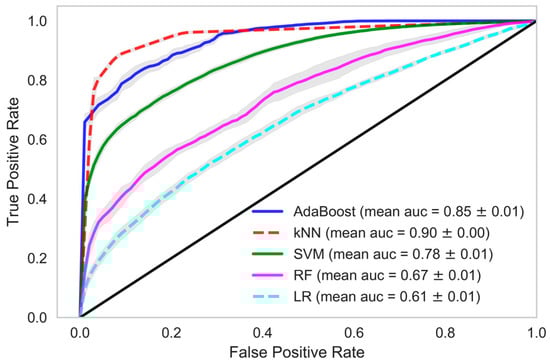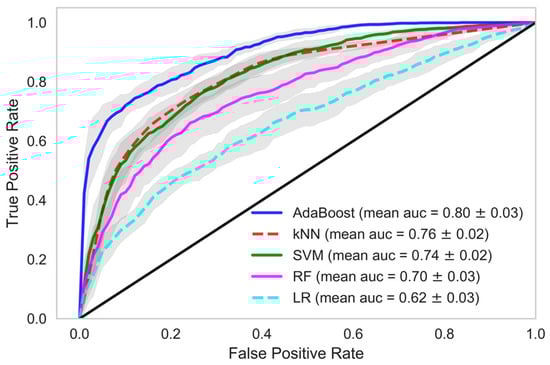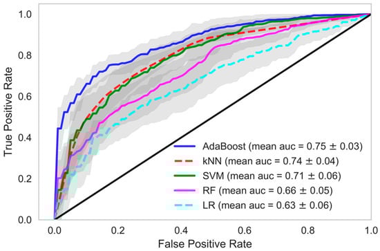 When we used data samples from recent 15 HD sessions to train the models, the performance of the classifiers was in line with those reported using data samples from all HD sessions. The mean accuracy of the kNN classifier was observed to be 87.95% with 89.01% AUC, 96.35% precision and 86.64% recall. The performance of the AdaBoost classifier in model 1, when this dataset was used, was also similar. A mean AUC of 85.38% with 81.86% recall and 95.09% precision was observed. The comparison of all the classifiers under each model considering various evaluation criteria was shown in Table 4, when data samples from all the HD sessions were considered in developing the model. In Table 5, evaluations of all the classifiers are shown when the models were developed using only the data samples from the 15 recent HD sessions. The ROC AUC plots of all the models depicting the mean area under the curve is presented in Figure 2, Figure 3, Figure 4, Figure 5, Figure 6 and Figure 7. The ROC AUC plots of each classifier under each model when the data samples from all the HD sessions were considered are shown in Figure 2, Figure 3 and Figure 4, respectively, and the ROC AUC plots when data samples from the 15 recent HD session were considered are shown in Figure 5, Figure 6 and Figure 7, respectively.