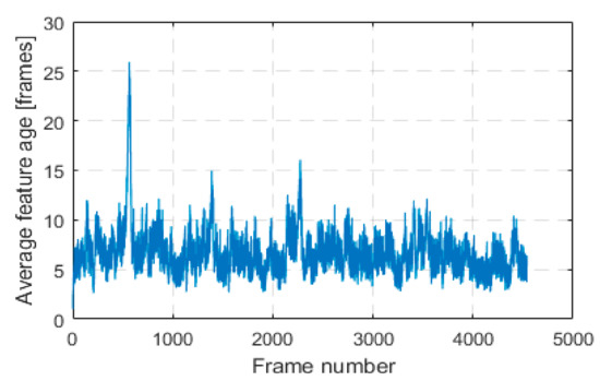 An important observation is that through our innovative approach of keeping features alive in a local 3D map and tracking them for as long as possible, we were able to greatly improve estimation accuracy compared to LIBVISO2. LIBVISO2 follows the traditional visual odometry approach of tracking features between consecutive frames, that is, from frame to frame only. We will define feature age as the number of frames in which this feature was successfully tracked and used in pose estimation. Average feature age in each frame for KITTI sequence 00 is shown in
