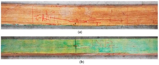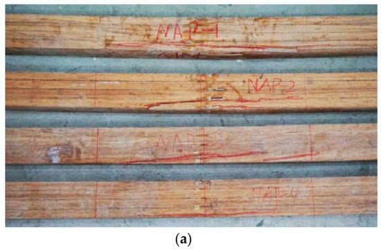 Failure photos on the side surfaces and bottom surfaces are shown in Figure 3. All specimens experienced elastic stage, elastic-plastic stage, and failure stage. Typical bending failure happened for all four beams. The first crack always appeared on the bottom surfaces in the pure bending area for the beams. Natural bamboo joints are the main reason for the first cracks.