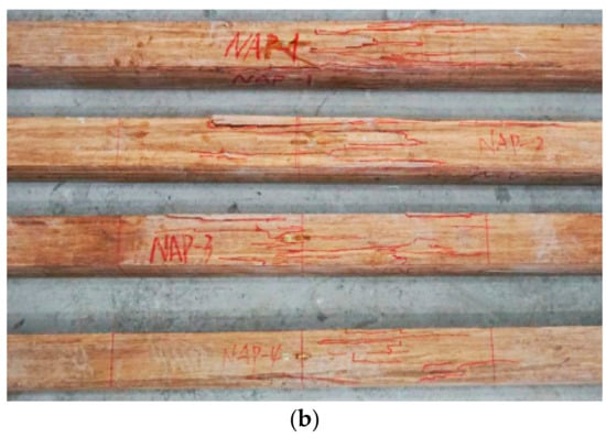 This is the failure photos for parallel bamboo strand lumber (PBSL) beams: (a) is the side surfaces; (b) is the bottom surface.
