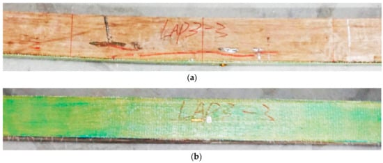 With the size of 80 mm × 100 mm × 1860 mm, 13 beam specimens were designed considering AFRP cloth ratios. Detailed information can be seen from Table 1. The cross section for the beam can be seen from Figure 1a. PBSL was made from Jiangxi Feiyu Bamboo Group Co. Ltd. (Fengxin, China). With a thickness of 0.193 mm, AFRP were bought from Carbon Composites Materials Co. Ltd. from Tianjin, China. The test tensile strength and elastic modulus of AFRP were 1893 MPa and 2023 GPa, respectively. The specimens are divided into four groups according to the layer of AFRP. No AFRP cloth was pasted for Group NAP. As for LAP1, LAP2, and LAP3, 1 layer, 2 layers, and 3 layers were pasted on the bottom of each group, respectively. AFRP covered the whole bottom surface as show in Figure 1b.