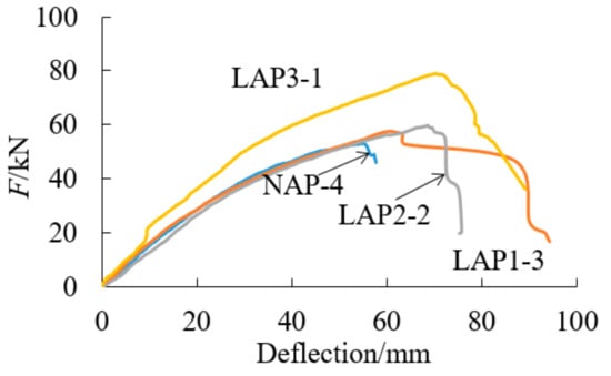 Table 3 shows the mid-span displacement comparison under different load values for all four groups. As it can be noticed from Table 3, under the same load, the mid-span displacement of the AFRP PBSL beams is smaller than that for PBSL beams, which indicates that AFRP plays a certain role in strengthening the stiffness of the specimen. Especially for group LAP3, the average mid-span displacement of the specimens is obviously smaller than that of other specimens.