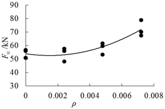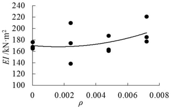 Figure 11 shows the variation trend for the flexural rigidity values with the increase of cloth ratios. Overall, the flexural rigidity increases when the cloth ratio increases. Group LAP1 has the largest discreteness among the four groups. When the cloth ratio reaches 0.72%, the mean flexural rigidity value of the specimen increases by 15% compared with the beams without AFRP cloth. It is concluded that bonding AFRP could improve the stiffness of the beam. Based on the test results, the following formula can be used to express the relationship between flexural rigidity and AFRP cloth ratio.