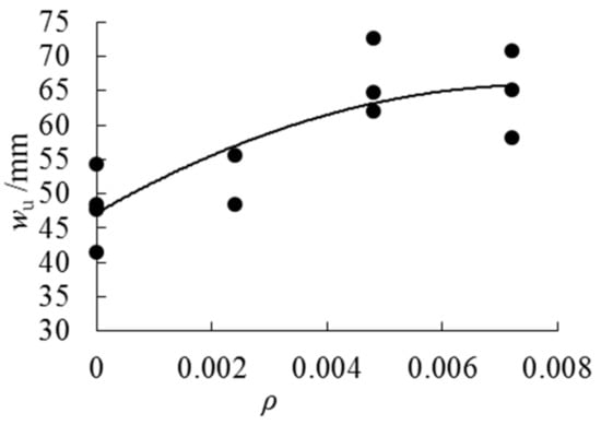 As can be seen from Figure 10, the ultimate deflection increases obviously with the increase of cloth ratio when the cloth ratio is less than 0.48%. The deflection of the specimens with a cloth ratio of 0.48% and a cloth ratio of 0.72% is similar. It is proved that AFRP cannot increase the deflection of the beam indefinitely.