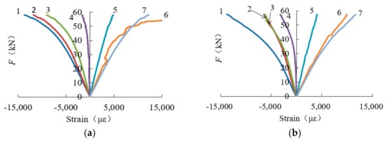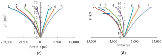 Typical load–strain curves for each group are shown in Figure 13. The load–strain curves both for the tensile and compression side of the beam are basically linearly changed during the elastic stage. As the load values become bigger and bigger, the curves belong to the compression side reaches the elastic stage limit earlier compared with the tensile side. As loading continues, the strain curves under compression enter the elastic-plastic stage, and line 4 for the strain values in the central line starts to curve as the middle strain gauge in the side surface begins to undertake compression strain. This means that the neutral axis begins to move downward.