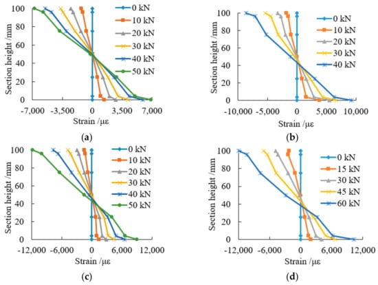 Figure 14 shows how the strain values change along the cross-sectional height with the increase of load. It can be observed that the cross section strain for the beams shows an approximately linear distribution along the height direction, meaning the specimen basically accords with the assumption of the plane section.