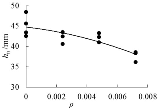 The neutral axis position for all specimens is shown in Table 4, and Figure 15 plots how the neutral axis changes with increasing cloth ratio. It can be noticed that when the specimen reaches the ultimate load, all the neutral axis height values are less than 50 mm (half of the beam height), which means that the neutral axis moves downward. The neutral axis of the specimen with AFRP cloth moves down more than the specimens without AFRP cloth, and as the number of layer increases, the neutral axis decreases. This phenomenon shows that the AFRP cloth plays a certain role in the pulling force. The more the neutral axis goes down, the bigger the pulling force AFRP cloth will bear.