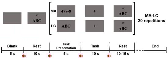 Experimental paradigm of one session used in the main experiment. In the beginning of each session, a rest period of 10 s is performed. The string ‘ABC’ and an asterisk are presented to indicate a rest period and the subject is asked to fix the eyes to the asterisk to minimize ocular movement. After the rest period, either mental arithmetic (MA) or light cognitive (LC) task is randomly performed. For MA, a pair of a three-digit number and a single-digit number between 5 and 9 is randomly presented, and the subject is asked to sequentially subtract the single-digit number from the three-digit number (e.g., 477 − 8) for 10 s. For LC, the string ‘ABC’ is presented, and the subject is asked to internally imagine vocalization of the English alphabet from A to Z with a 1 Hz speed for 10 s. Both MA and LC are performed ten times in each session, and each subject completes five sessions (50 MA and 50 LC in total). A short beep (300 ms) is presented at every screen transition (red speaker icons).