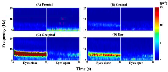 For the EEG data measured in the preliminary experiment with EC and EO, time-frequency analysis was performed using a short-time Fourier transformation (window size: 1 s, 50% overlap). Spectral powers in a frequency band from 5–15 Hz, containing the α-band (8–13 Hz), were used to investigate alpha power changes between the EC and EO conditions. Relative changes of mean alpha power from EO to EC (signal-to-noise ratio: SNR) were estimated in decibels for the four ROIs (frontal, central, occipital, and ear area). The SNR is simply given as:
