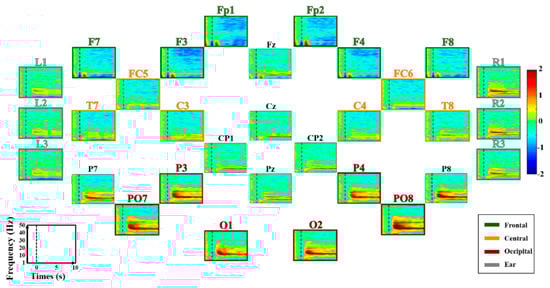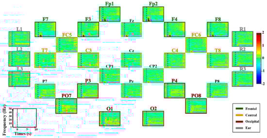 Grand average ERD/ERS maps of all electrodes during LC. The four regions of interest (ROIs), frontal, central, occipital, and ear area, are denoted by four different colored lines and titles for each map (green, orange, red, and gray), respectively. The x- and y-axis of each map indicate the task time from −2–10 s based on task onset (t = 0 s), and the frequency band ranging from 1 to 50 Hz, respectively. ERD and ERS are presented in blue and red, respectively. Note that scalp- and ear-EEG are independently re-referenced using a CAR and a modified CAR, respectively.