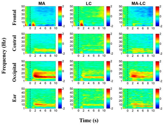Grand average ERD/ERS maps of each ROI during MA and LC, and their differences (MA-LC). The ERD/ERS maps of ear area (denoted by ‘Ear’) are obtained by averaging the six electrodes attached behind both ears (three electrode for each side). The x- and y-axis of each map indicate the task time from −2–10 s based on task onset (t = 0 s), and the frequency band ranging from 1 to 50 Hz, respectively. ERD and ERS are presented in blue and red, respectively.