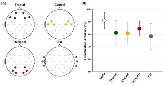 (A) Electrode positions used to create each ROI, and (B) the mean classification accuracies of the four ROIs with that obtained using all electrodes (‘Scalp’), excluding the six ear electrodes. Each ROI was individually re-referenced, where a CAR was used for the scalp ROIs (‘Scalp’, ‘Frontal’, ‘Central’, and ‘Occipital’) while the mean of three electrodes attached on an opposite ear area was used as a reference signal for ear ROI (‘Ear’). Error bars indicate standard deviations of the estimated classification accuracies of each ROI. There is no significant difference between the four ROIs (Friedman test; p = 0.63).
