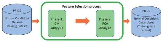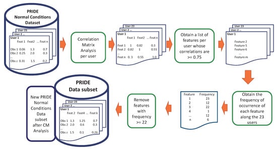 The experiments were conducted in R language, in the RStudio software (version:1.0.153 , RStudio Inc., Boston, MA, USA) []. The correlation matrix was computed using the well-known caret package []. Firstly, we performed the CM process to remove redundant features and then we applied PCA to remove features that do not contribute sufficiently to the principal components but at the same time retaining at least 60% of data variability [,,]. This process is illustrated in Figure 1.