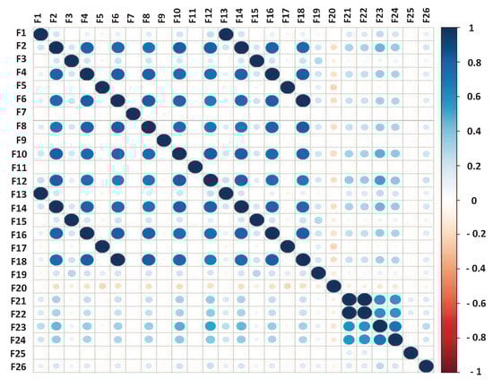 At this point, we have performed a feature selection procedure based on a correlation matrix and Principal Component Analysis in order to reduce the dimension of the PRIDE dataset and thus reduce execution time by keeping a comparable performance of the classifiers. After this procedure, nine attributes in the time-domain were removed without losing data representativeness: five attributes by means of the correlation matrix analysis (F2, F6, F10, F14, and F18) and four attributes by applying Principal Component Analysis (F7, F9, F11, and F26). The complete feature selection process just described is summarised and shown in Figure 5 and Figure 6.