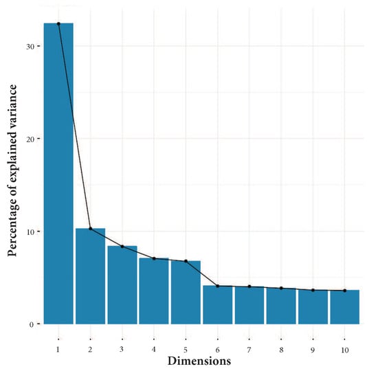 Figure 3 shows the results of PCA computed over the PRIDE user with more data, user 1. It shows the percentage of the explained variances across ten dimensions. It can be observed, by aggregating the contribution of each dimension, that the first five dimensions explain approximately 60% of data variability [,,]. Figure 4a–e depict a plot for each of the first five dimensions, with contribution percentage per variable in such dimension. Additionally, Figure 4f shows the contribution percentage of each variable to the aggregated first five dimensions. All plots are related to user 1.