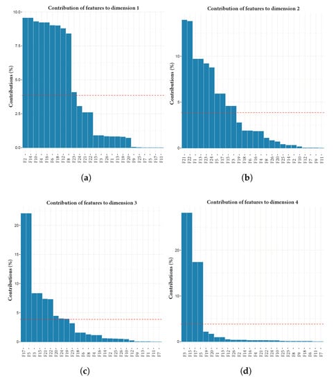 After we computed PCA over the 23 users, we totalled the frequency of occurrence of each feature along the first five dimensions of all users. A feature is included in this count if it had a contribution value over the expected average contribution of all features. The red line in each plot of Figure 4 represents the expected average contribution of all features if their contributions were uniform. This means that the highest possible value of a feature is 115, i.e., it is above a threshold in all five dimensions for every user (). From this sum, we removed from the dataset those features that never contributed (or contributed insufficiently) to any of the first five dimensions, i.e., the dimensions necessary to preserve at least 60% of data variability.