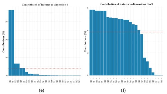 PCA results for user 1. Each graph represents the contribution of every feature to data variability in (a) dimension 1; (b) dimension 2; (c) dimension 3; (d) dimension 4; and (e) dimension 5; (f) contribution of every feature in the aggregated five dimensions.